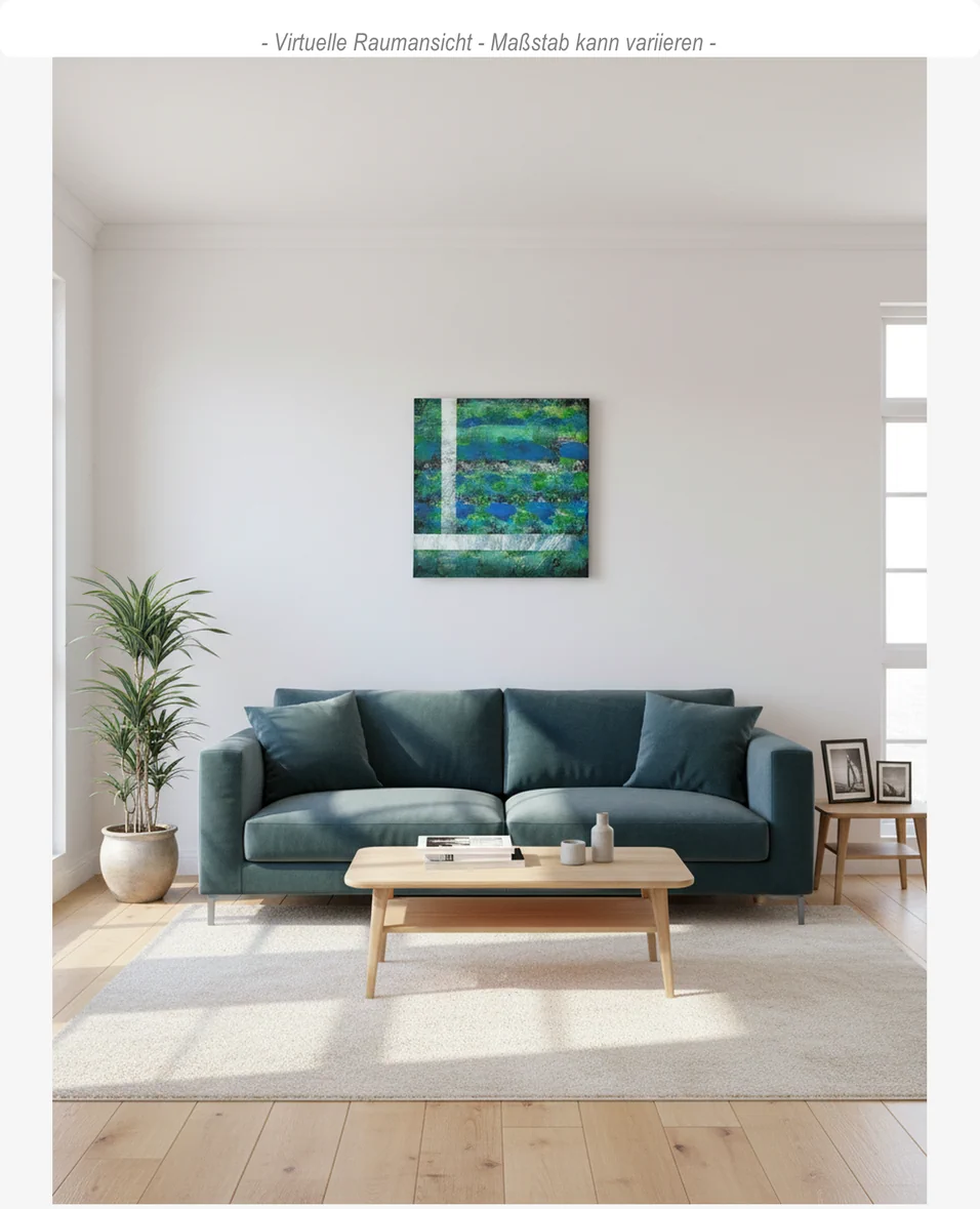 Tiefe Blau- und Grüntöne fließen wie eine bewegte Landschaft unter klaren, hellen Linien.