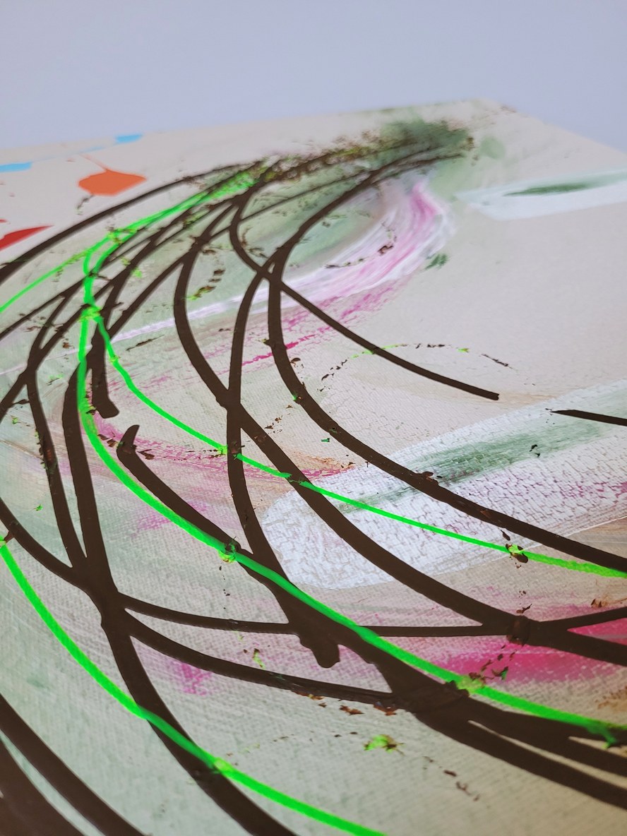 Die geschwungenen Linien, in leuchtendem fluoreszierendem Grün gehalten,