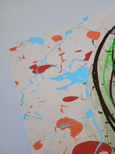Farbintensive Sprenkel, aufgeschleudert, verleihen dem Werk eine lebendige, ungezähmte Energie.